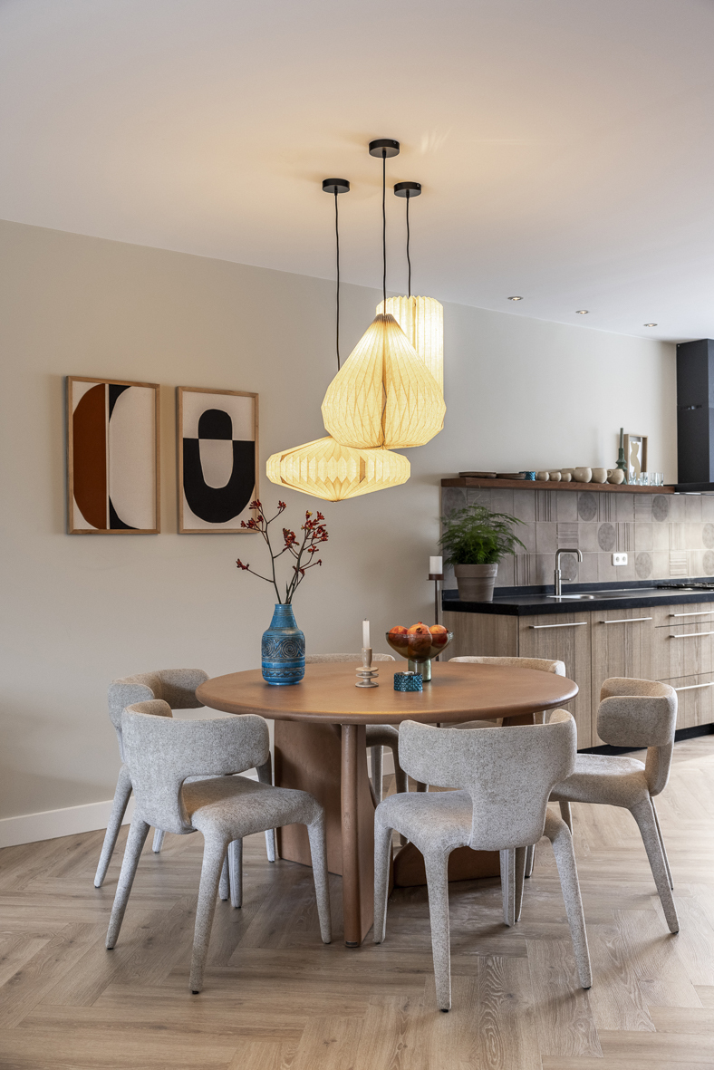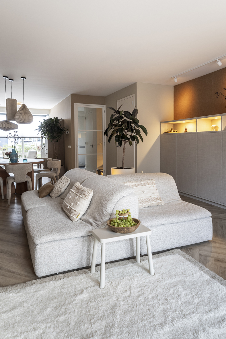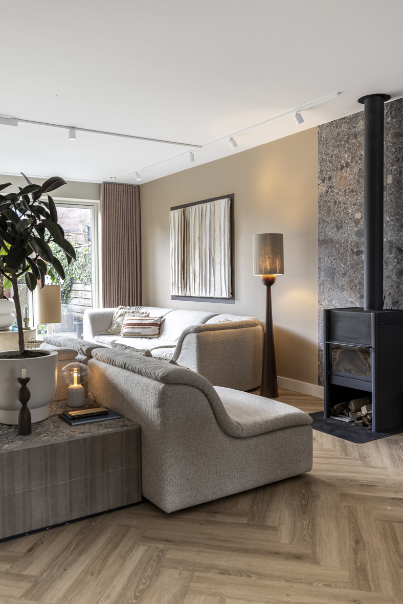 Dankzij de deskundige hand van Frans is het huis van Dirk en Agneta volledig getransformeerd tot een sfeervol en stijlvol thuis. De combinatie van warme kleurtinten en natuurlijke materialen brengt een perfecte balans tussen rust en gezelligheid.