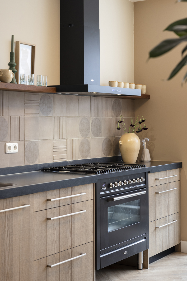 Voor de keuken werd gekozen voor een verfpalet dat warmte en gezelligheid uitstraalt: