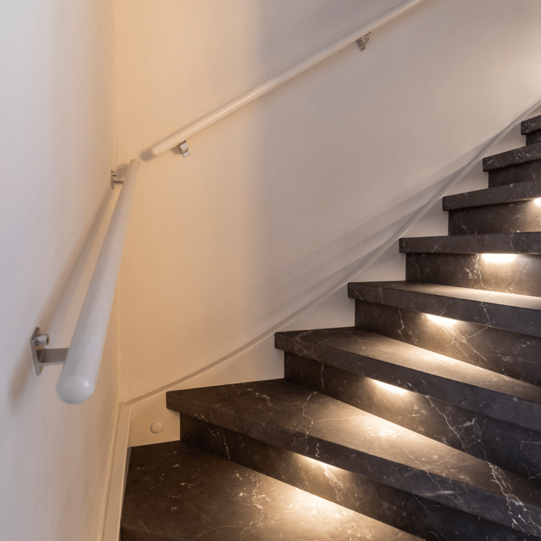 Om de ruimte een frisse en tijdloze uitstraling te geven, werd gekozen voor RAL 9010. Deze witte kleur werd aangebracht op de trapwangen. Deze klassieke, witte tint zorgt voor een lichte en luchtige uitstraling en vormt een mooie basis voor de rest van het interieur. Voor de trapwangen werd de Flexa Creations Lak Extra Mat gebruikt.