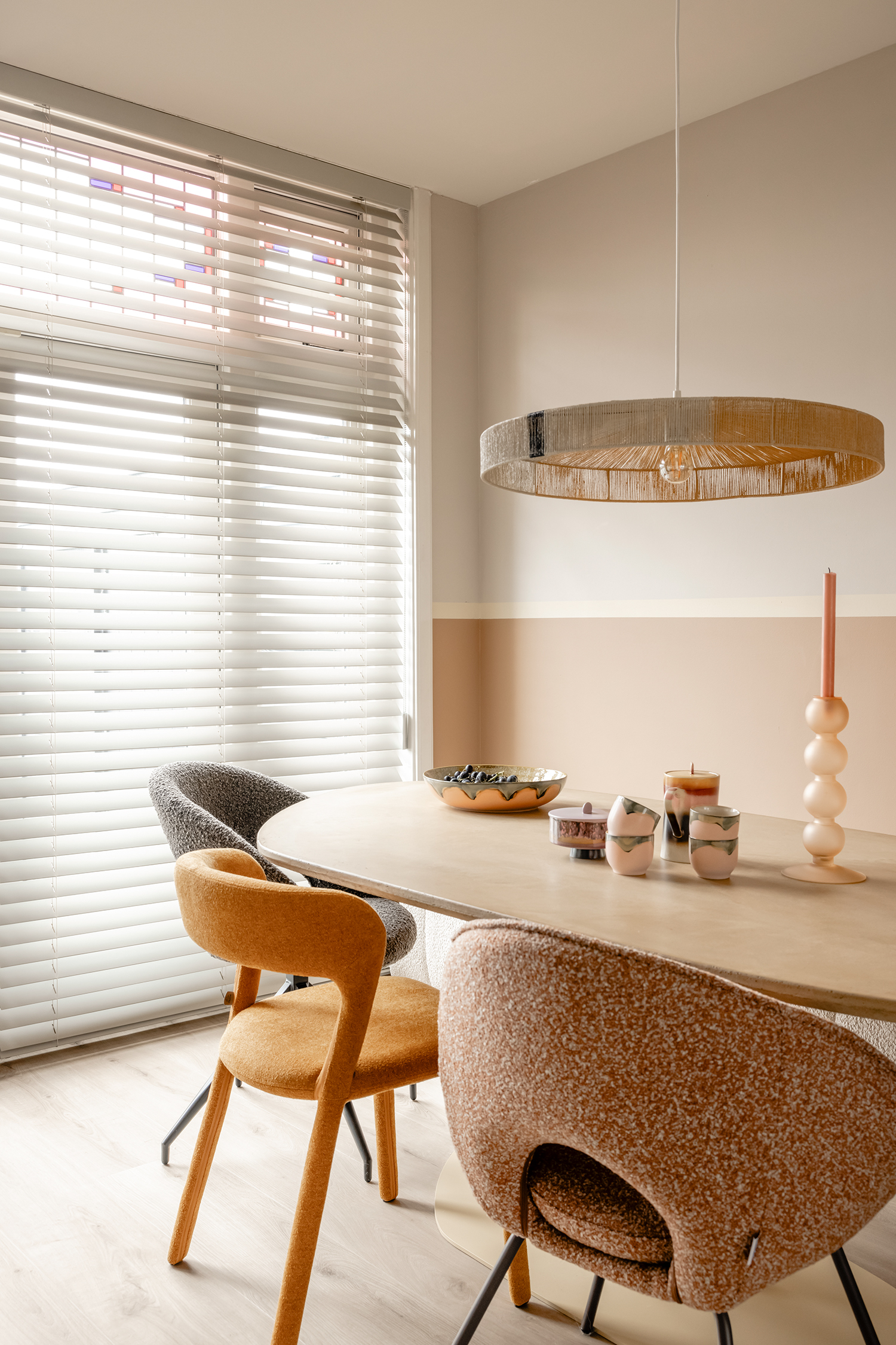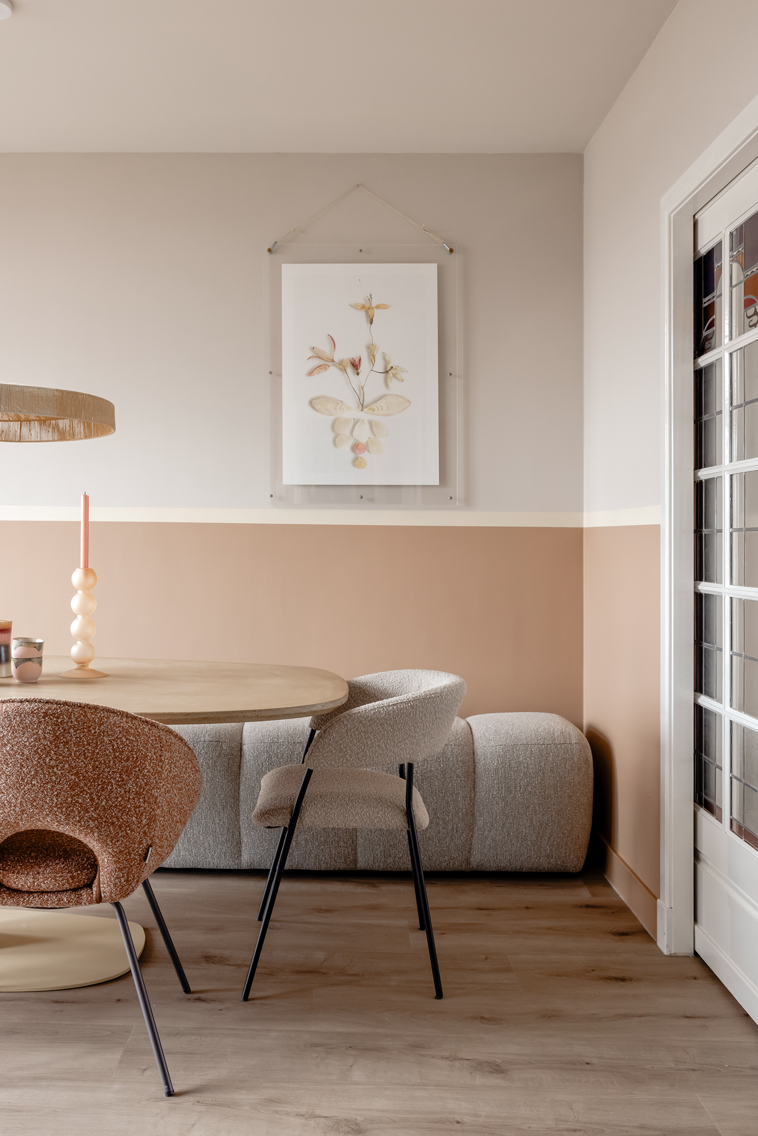 In de eethoek werd een verfijnd kleurenpalet gebruikt om een uitnodigende sfeer te creëren: