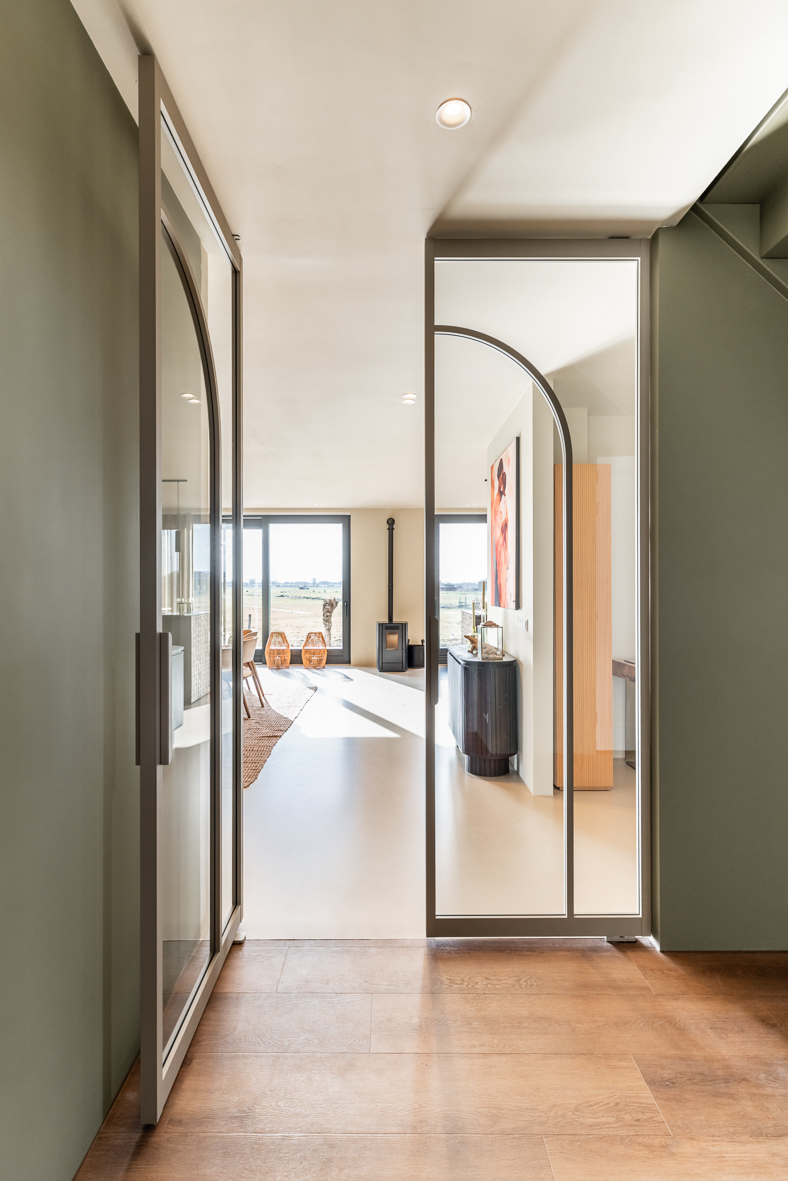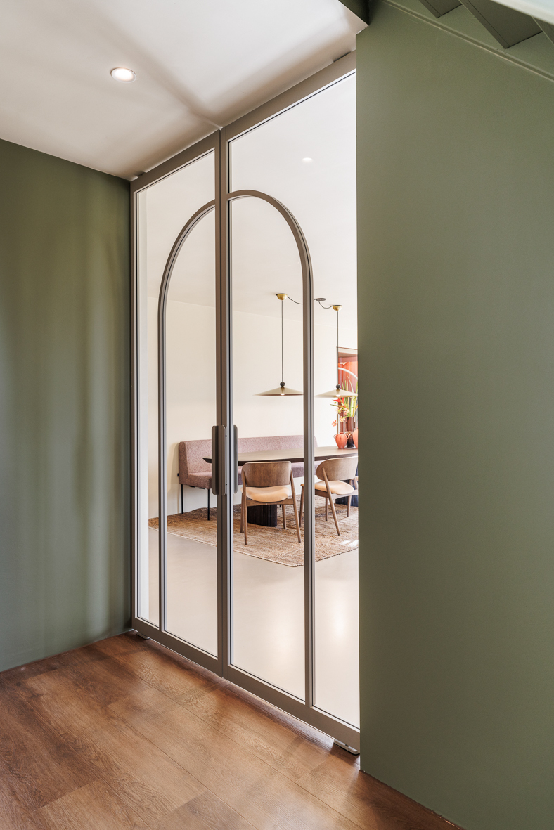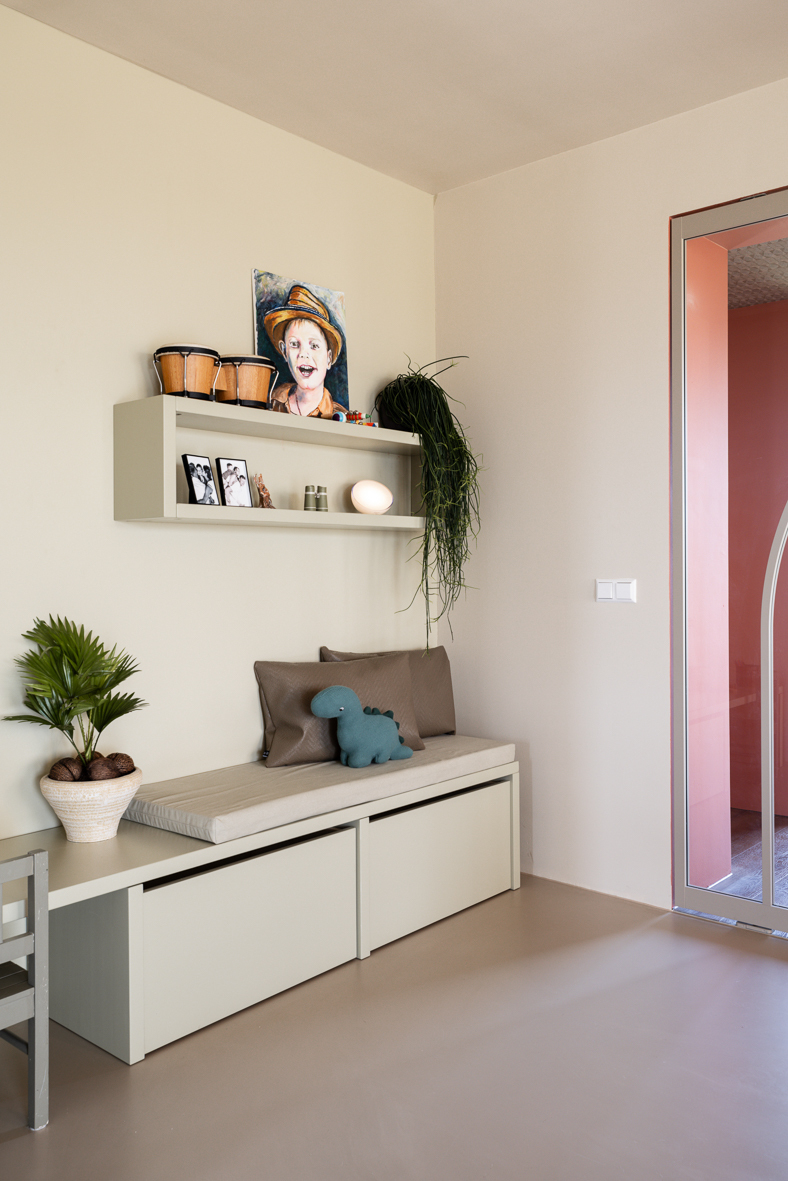 De rest van het huis kreeg kleurrijke accenten die de verschillende zones karakter geven: In de hal werd gekozen voor Olive 13 van Farrow & Ball, een rijke, groene tint die rust en diepte brengt. Voor de speelhoek koos Kelly de kleur Ball Green 75 van Farrow & Ball, een zachtere groentint die licht, speelsheid en vriendelijkheid uitstraalt – ideaal voor een plek waar geleefd wordt.