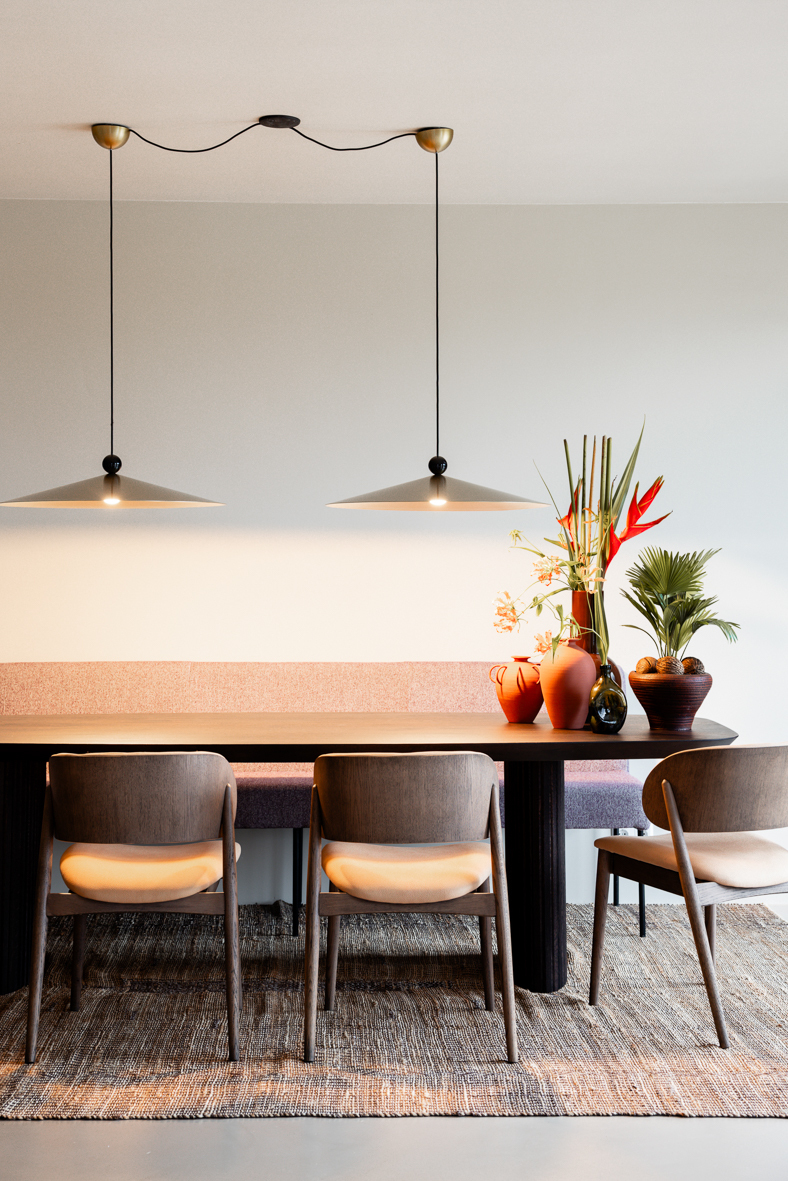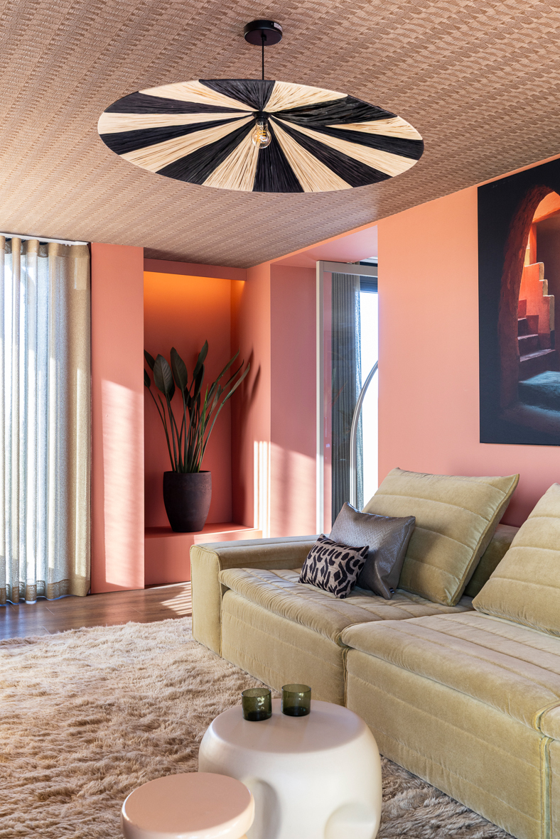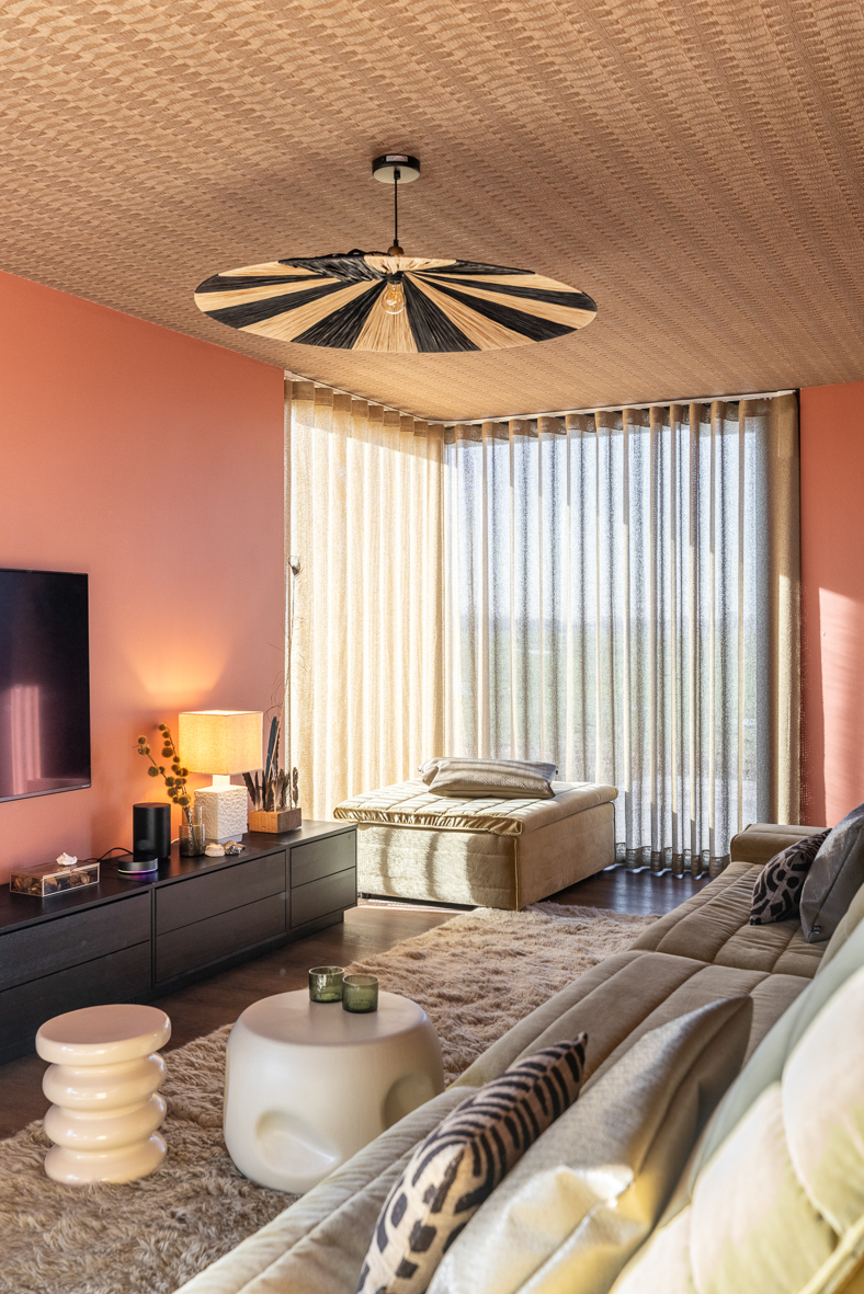 Om Shelley's verlangen naar warmte en wereldse sfeer tot leven te brengen, koos Kelly voor een diepe, karaktervolle tint: De kleur Red Earth 64 van Farrow & Ball, aangebracht op de muren in de woonkamer, zorgt voor een rijke en warme uitstraling. Het geeft de ruimte karakter en maakt het meteen een plek waar je je thuis én op reis voelt.